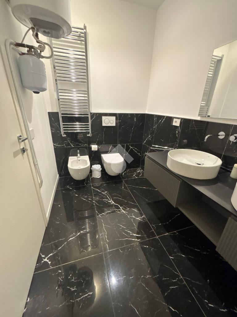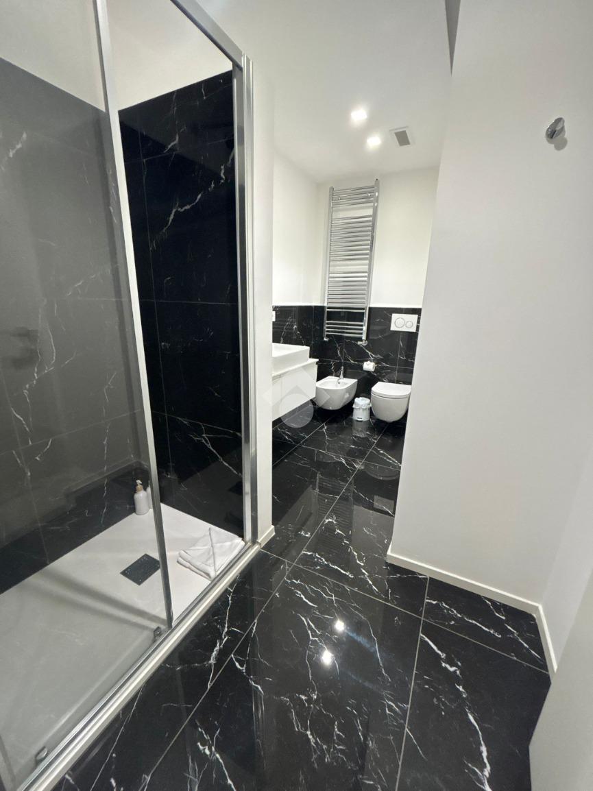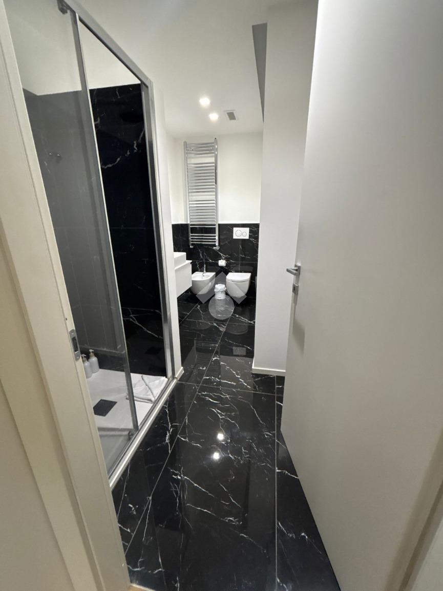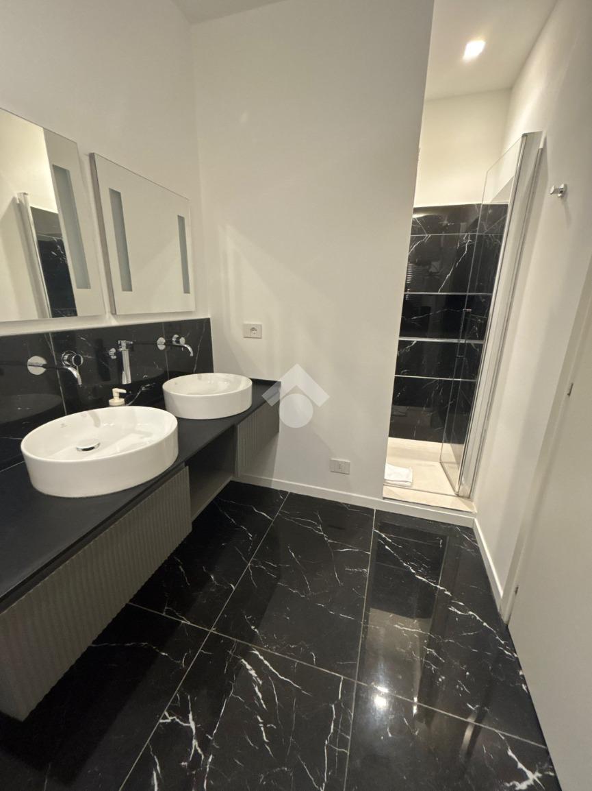 I bagni ampi in marmo, dotati di box doccia, sanitari sospesi di ultima generazione e doppio lavabo.