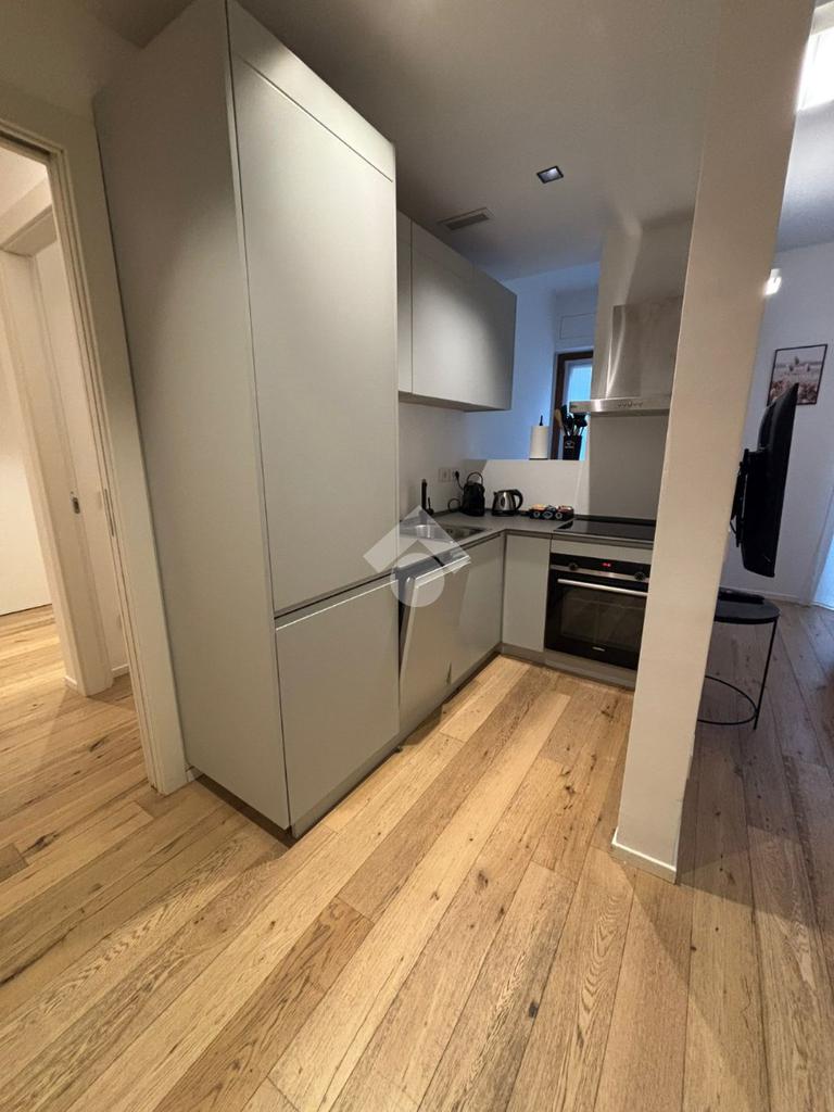 La cucina a vista, moderna, funzionale è dotata di tutti gli elettrodomestici necessari che valorizzano l'ambiente e il design della zona living, con balconi alla francese